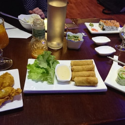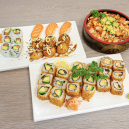 10 sushis assortis, 6 saumon rolls, 6 Califonia, 6 onion rolls, 6 nigiri makis et 6 makis printemps. Servi avec 2 soupes, 2 salades et 2 riz.