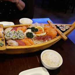 3 sushis, 8 sashimis, 3 gyoza et beignet de poulet. Servi avec salade, soupe et riz.