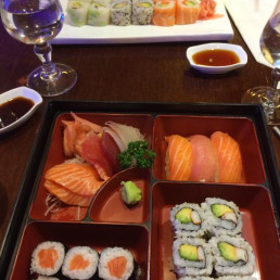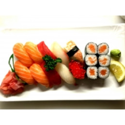 Assortiment de 10 sushis et 6 makis. Servi avec soupe et salade.