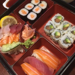 6 California saumon avocat, 3 sushis saumon et 6 raviolis grillés. Servi avec salade, soupe et riz.