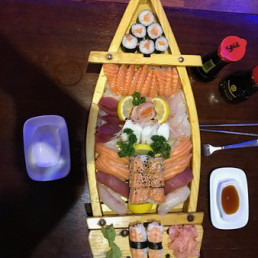 10 sushis variés, 6 nigiri makis, 6 makis saumon 8 brochettes "2 poulet, 2 boulettes de poulet, 2 bœuf au fromage, 2 courgettes" et 30 pièces de sashimis assortis. Servi avec 2 salades, 2 soupes et 2 riz.