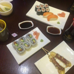 3 sushis, 8 sashimis, 3 gyoza et 3 brochettes "poulet, boulettes de poulet, bœuf au fromage". Servi avec salade, soupe et riz.